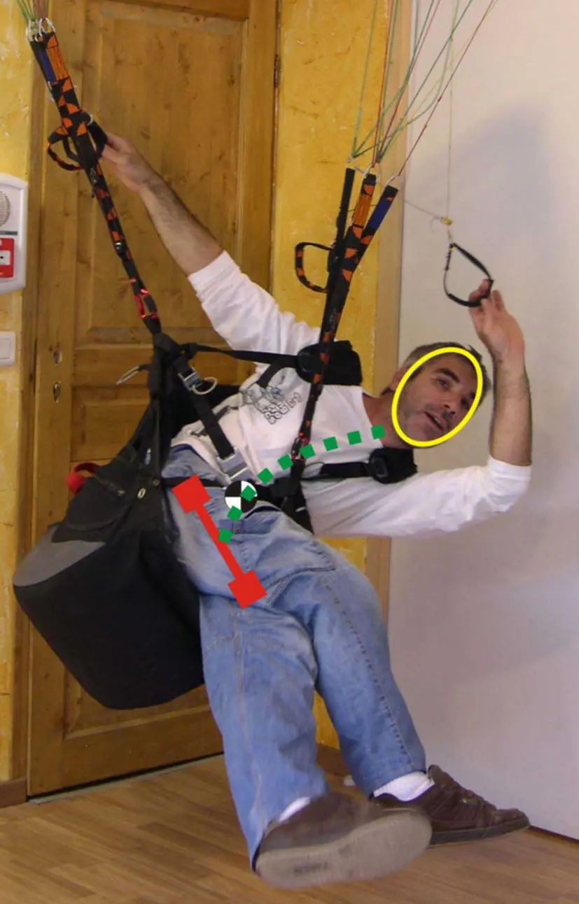 Lorsqu’on déclenche un virage à la commande depuis un régime de vol bras hauts, en abaissant une commande de frein, on provoque un phénomène allant contre notre volonté de virage : la demi-aile freinée a un meilleur taux de chute, et en plus, elle ressource. Cela provoque un mouvement de roulis du mauvais côté. Si le pilote est très passif à la sellette, c’est un vrai handicap au virage. Le pilote doit tirer beaucoup plus la commande pour obtenir le virage souhaité. En revanche, si le pilote met d’abord du poids du bon côté, il ne ressentira pas cet effet indésirable.