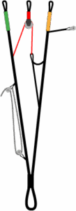 Ci dessous, un exemple de voile en “2 lignes 1/2”. Les arrières sont reliés à la ligne des C et des D aux centre par une pyramide. Il n’y a que 2 lignes A et B en bout d’aile. Les bouts d’aile sont bien reliés aux élévateurs arrière :