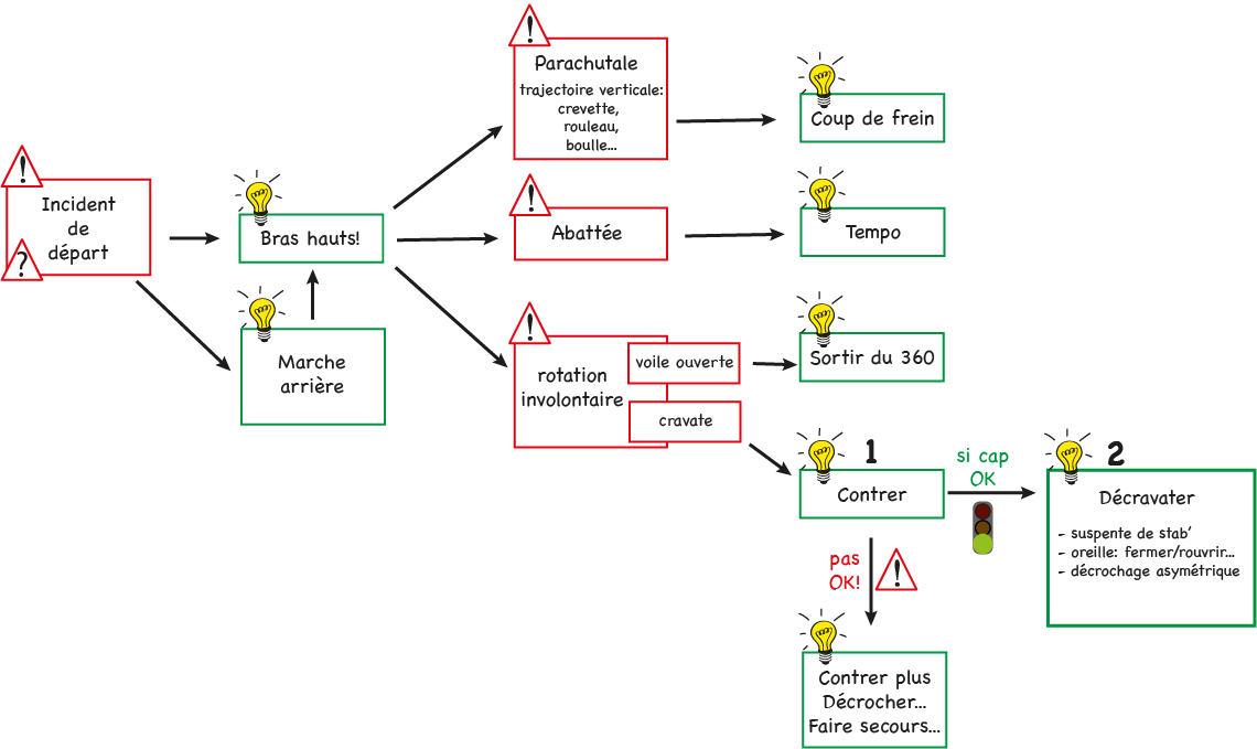 En cas de cravate (une partie de la voile est emmêlée dans le suspentage).